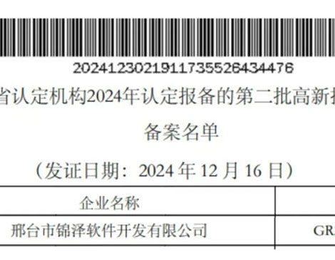 喜報丨熱烈祝賀邢臺市錦澤軟件開發(fā)有限公司獲評2024年度“國家高新技術(shù)企業(yè)”認(rèn)定