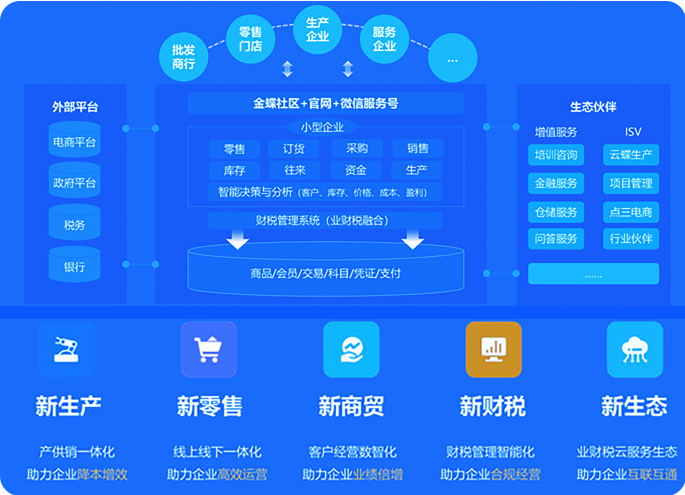 金蝶云·星辰基于金蝶云·蒼穹云原生PaaS平臺構(gòu)建,聚焦小型企業(yè)在線經(jīng)營和數(shù)字化管理,提供財務(wù)云、稅務(wù)云、進銷存云、零售云、訂貨商城等SaaS服務(wù),支持企業(yè)拓客開源、智能管理、實時決策; 金蝶云·星辰還提供輕量級PaaS平臺和全面的API接口,廣泛連接生態(tài)伙伴,為小微企業(yè)提供一站式服務(wù),助力企業(yè)快速成長
